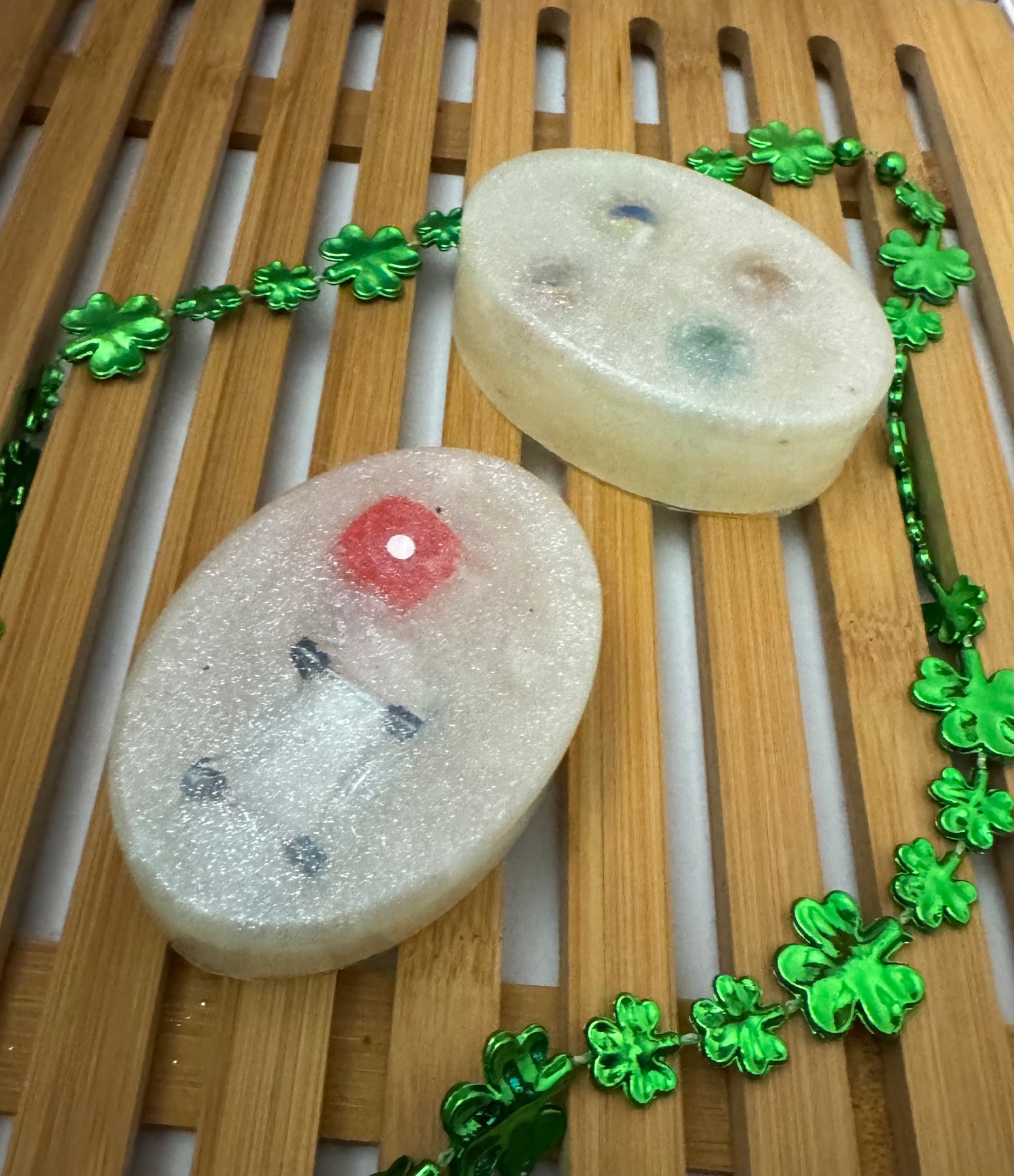 A key feature of the soaps in the image is the presence of objects embedded inside, such as a toy and a die. This is a common practice with glycerin soap, especially for products marketed to children, as the embedded prize or surprise can encourage them to wash their hands more frequently.