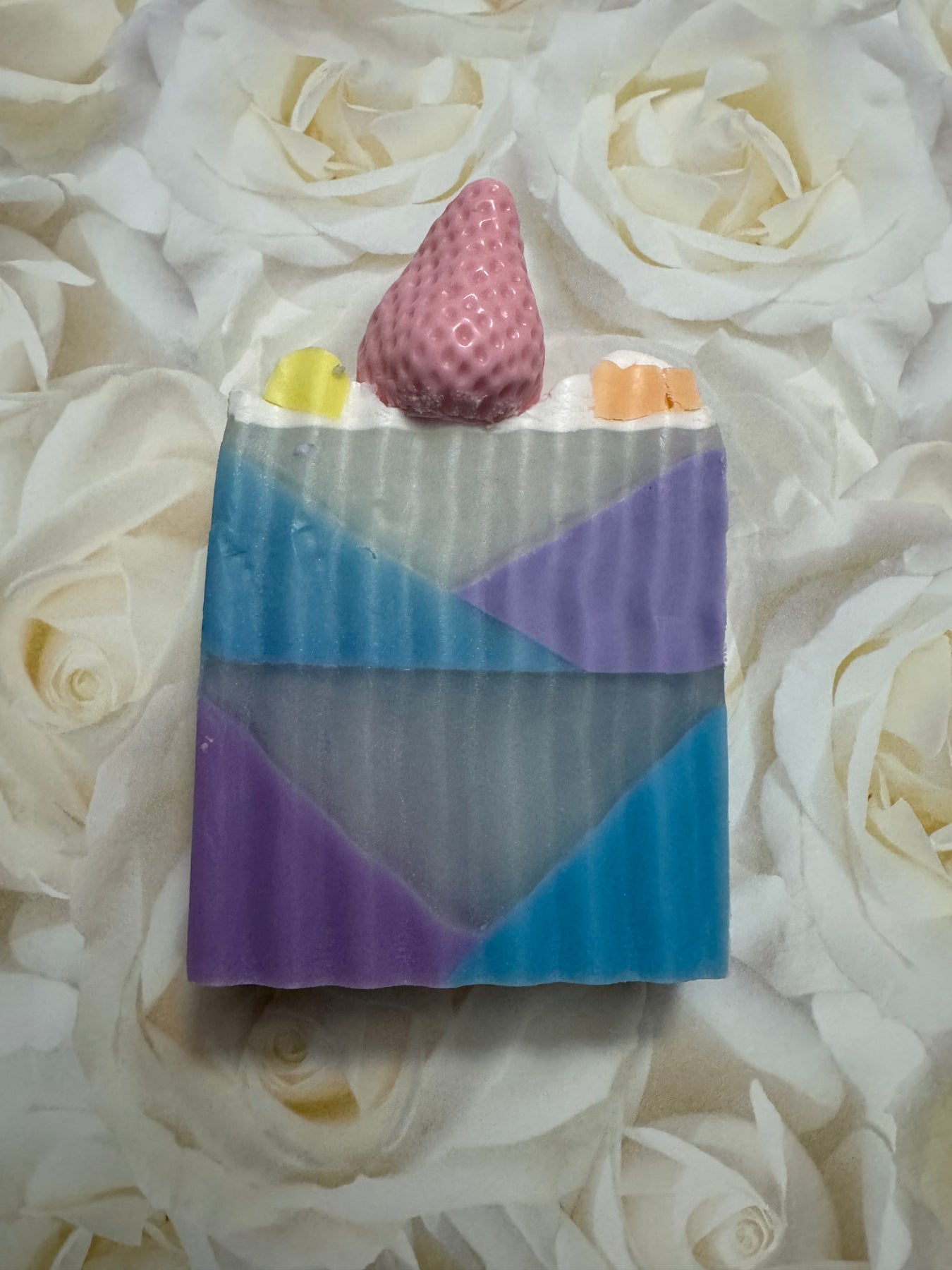 The magic in this bar will leave your skin feeling smooth and fresh.  This multi-colored soap showcases striking multicolored layers and merging functional skincare with artistic design. The translucent formulation allows light to illuminate the embedded pigments, creating visual interest while maintaining gentle cleansing properties. Ideal for sensitive skin, this bar delivers hydration without harsh additives. A sophisticated choice for discerning consumers who appreciate both efficacy and aesthetic refinement in their daily skincare routine.